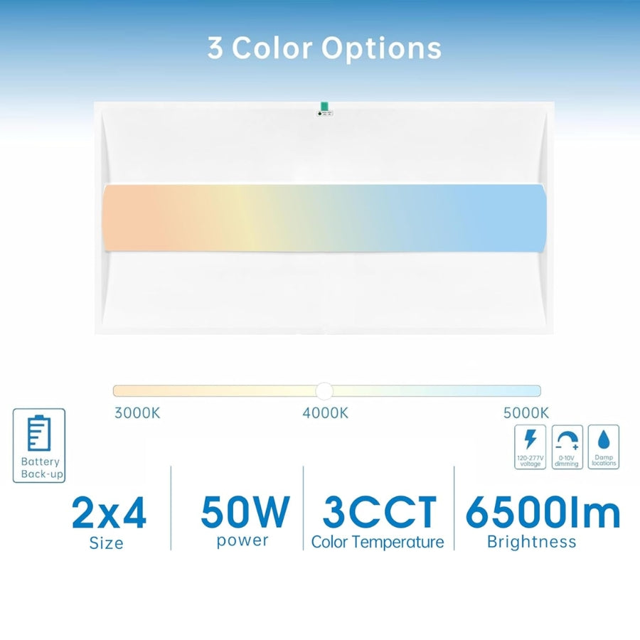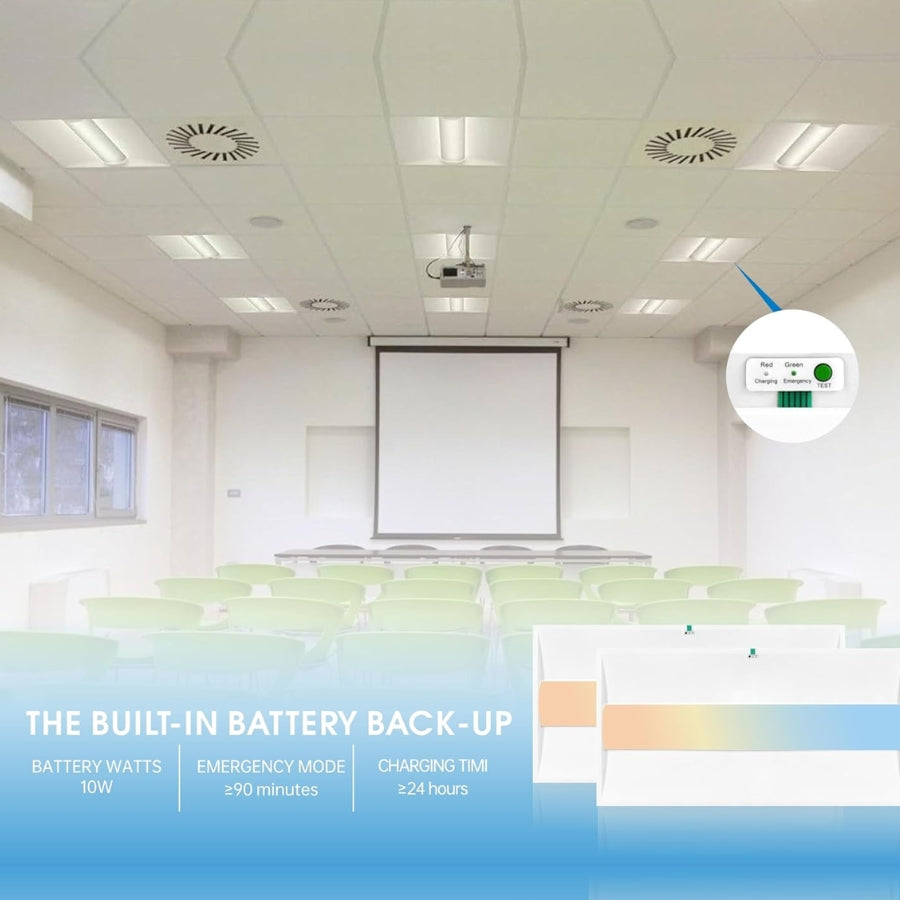 This troffer includes a built-in emergency battery backup that provides at least 90 minutes of light during power outages, supporting safety and compliance requirements. It also features 0–10V dimming capability for smooth brightness adjustment.