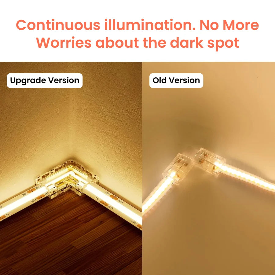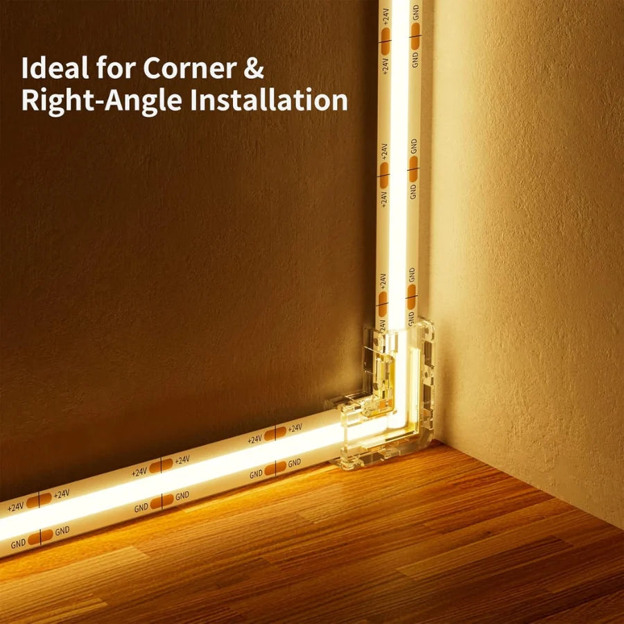 The FlipToLED 8mm COB Connector Kit is engineered for reliable corner turns and straight extensions on 8mm COB LED strip lighting without requiring any soldering. Designed strictly for 8mm single-color COB systems, these connectors ensure clean layout transitions and a continuous beam appearance at every corner and join point.