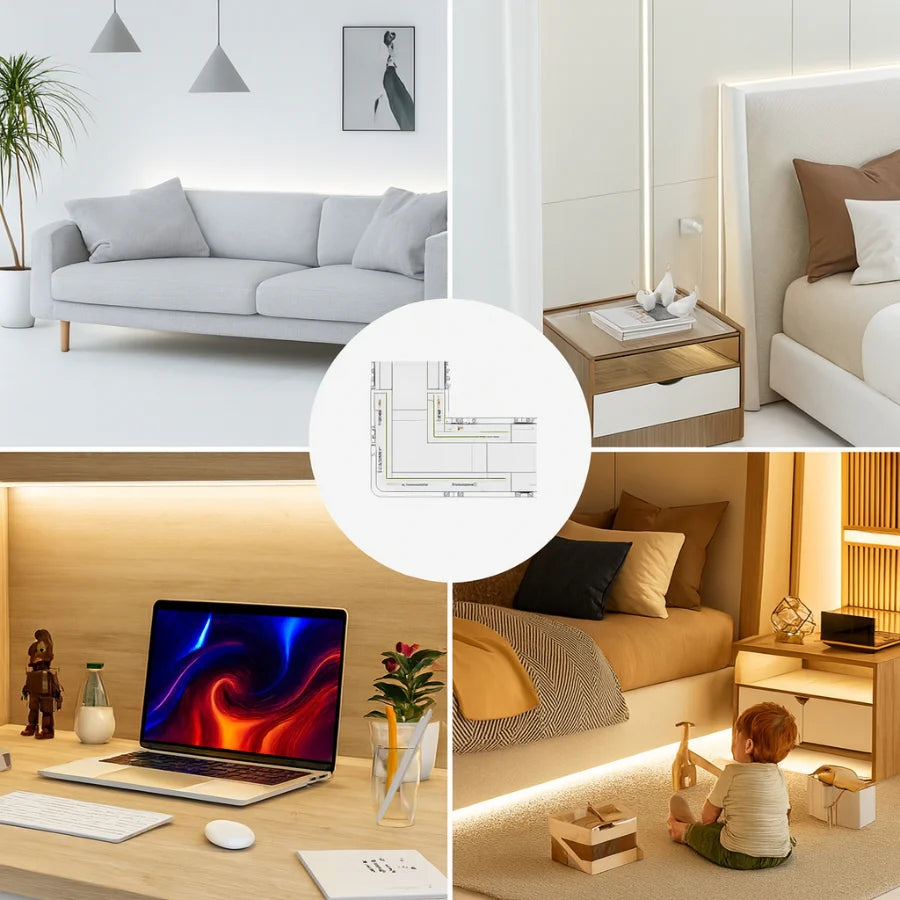 This kit includes eight L-shaped corner connectors and two transparent straight connectors for gapless strip joining. Each element uses a snap-on locking system that maintains pressing contact over time, supporting consistent electrical performance and eliminating visible breaks in illumination.