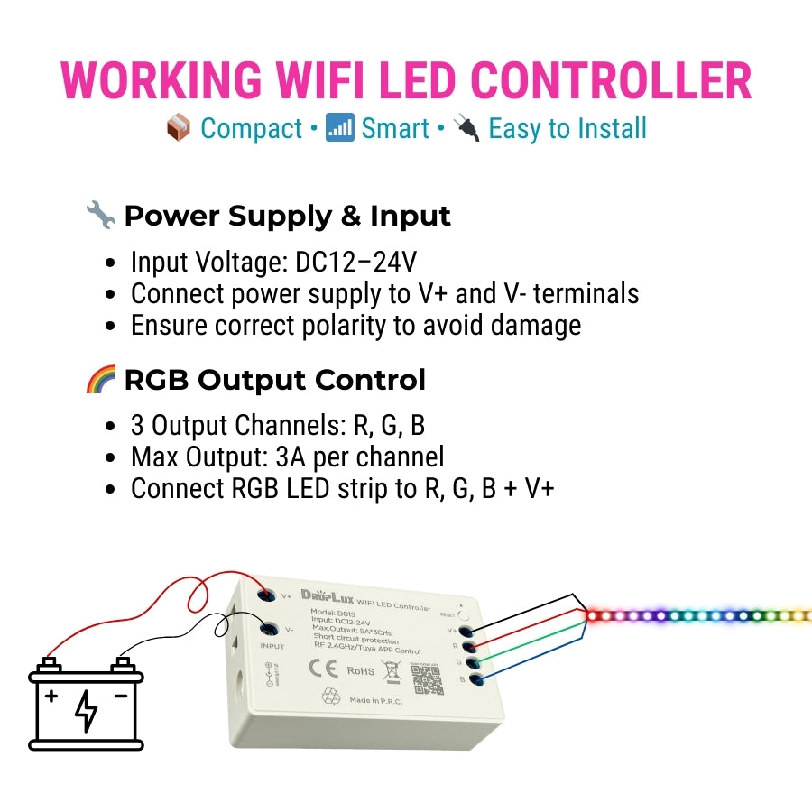 Wide Voltage Range: Compatible with 12V–24V DC LED systems.